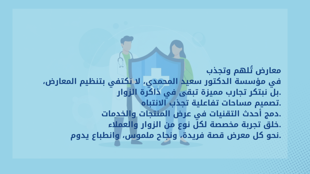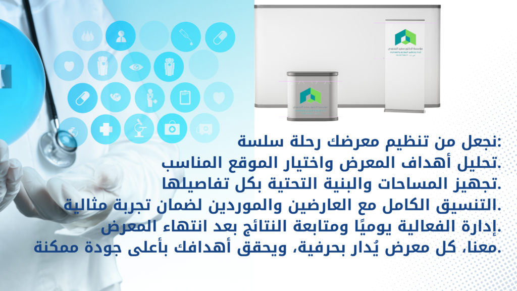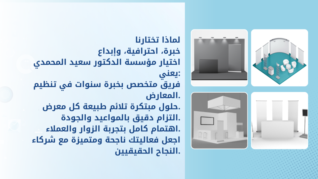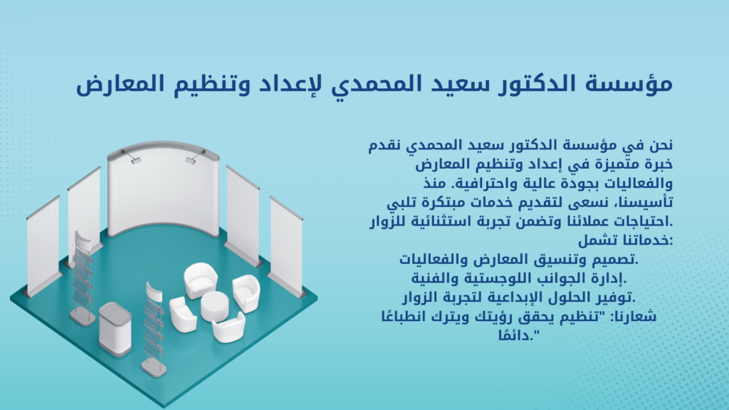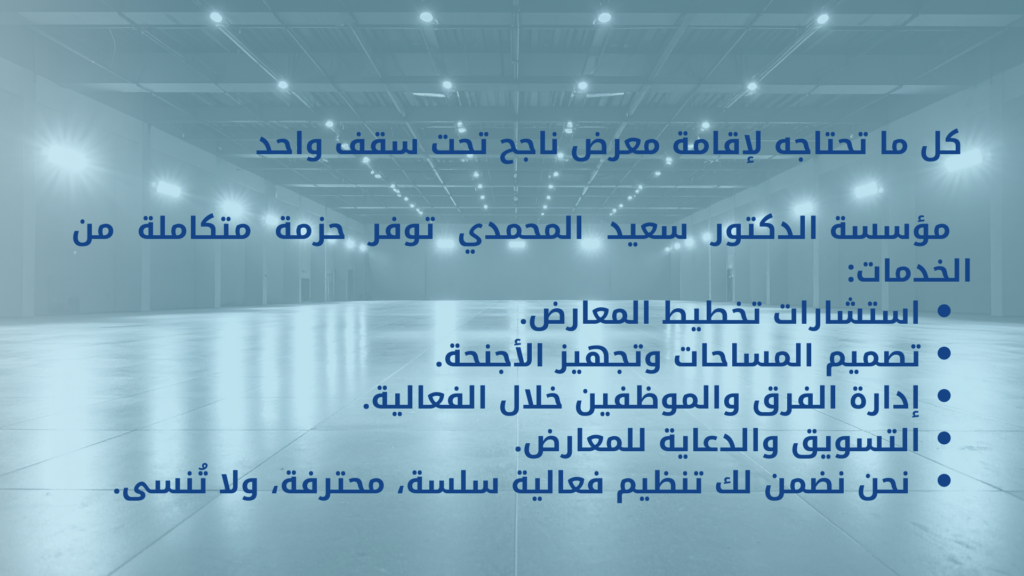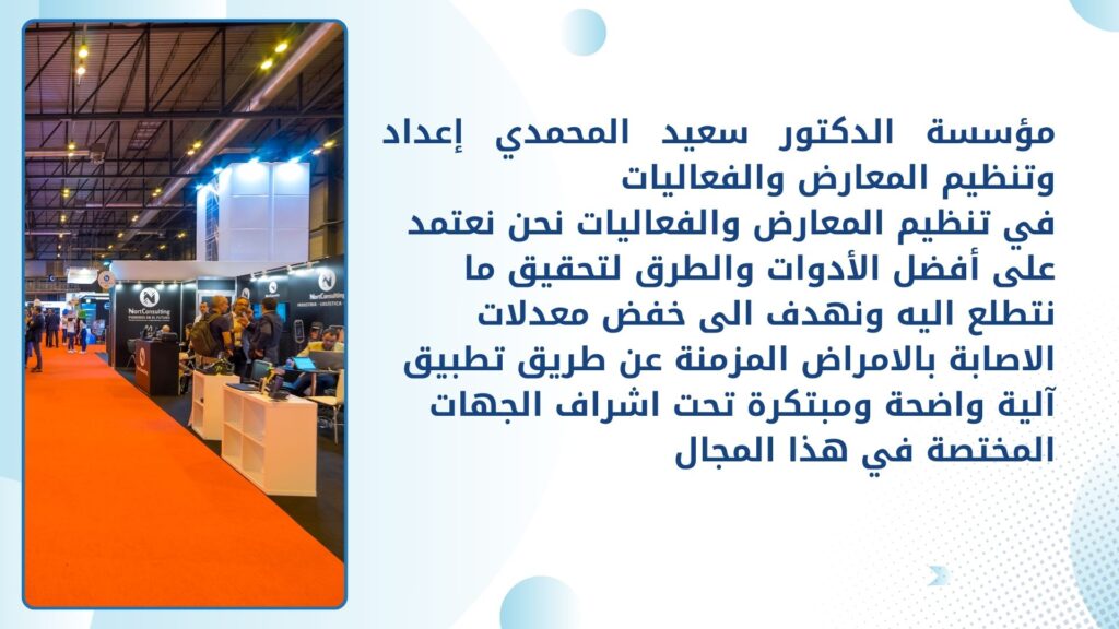 في تنظيم المعارض والمؤتمرات نعتمد على أفضل الأدوات في هذا المجال لتحقيق ما تتطلع اليه عن طريق آلية واضحة ومبتكرة تتلخص بالتالي :